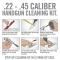 Ce kit de nettoyage d'armes de poing, pour les calibres .22, .9 mm / .357/ .38, .40, .45, de marque américaine, contient 13 pièces différentes : brosses en bronze, poignée multi-fonctions, patch pour appliquer du solvant, etc.