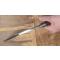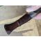 Joli petit kukri népalais traditionnel, dit "villageois", pour les cérémonies. Fourreau en bois et cerclage de laiton, décoré de motifs sculptés traditionnels. Logements pour le chakmak et le karda (absents). Lame à soie queue de rat, avec gouttièrre ciselée. Mitre avant en acier à pans. Le fourreau a subi des réparations successives, le choix ayant été fait de le conserver plutôt que de le remplacer. Manche en bois exotique avec une enture ancienne à l'extrémité portant des marques d'un polissage par usage. Kukri ayant appartenu à une famille népalaise qui se l'est probablement transmis de génération en génération, comme en témoignent les réparations successives du fourreau et le poli naturel du manche, dû à une manipulation sur une longue période. Jolie pièce qui a son histoire, et témoignage touchant des traditions népalaises. Datable de l'entre-deux-guerre : années 1920-1930. Longueur du kukri : 33,5 cm