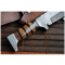 Je connaissais PERKIN de part sa réputation, et franchement ici elle n'est pas usurpée ! C'est du sérieux ! C'est du lourd comme on l'aime, et ceci dit; tant au niveau des finitions que de la qualité des matériaux utilisés ! C'est vraiment une très belle lame massive, au tranchant effrayant ! Son manche en soie tendue sur un empilage de laiton, bois clair et ébène est super classe, avec en prime une prise en main naturelle, son fourreau cuir pleine fleur est tout simplement magnifique !