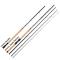 Il y a 2 principaux intérêts à utiliser de tels anneaux : il n’y a plus de risques de casse de la céramique, au pire une déformation mais sans rupture, mais surtout un gain de poids très significatif qui se ressent immédiatement à la prise en main des produits. Toute cette gamme a été réalisée en 4 brins égaux, y compris le modèle nymphe, ce qui permet d’avoir des produits hyper compacts pour le stockage et le transport. Composée d’une canne orientée nymphe en 3m40, et de 2 cannes plutôt typées appâts naturels en 3m90 et 4m20 ; cette gamme est idéale pour le pêcheur recherchant un produit innovant et l’utilisant partout et tout le temps.