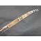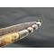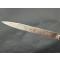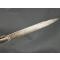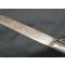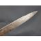 Long couteau de chasse de Châtellerault fin 19è, lame patinée et oxydée longue de 22.5cm, petit jeu à l'ouverture et fermeture, ressort à mouche, manche en plaquettes de corne de cervidé et de bovin, mitres en fer patinées, deux anneaux d'origine.
