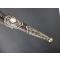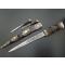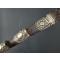 Long couteau Dirk écossais des Highlands à poignée en ébène sculptée, vers 1900, garniture en argent estampées en relief de chardon emblème de l'Ecosse. Lame de 27cm avec fines taches d'oxydation. Fourreau bois recouvert de cuir, garnitures à logement pour couteau et fourchette utilitaires. Longueur totale 44cm
