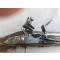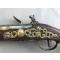 Grand pistolet d'arçon de la première moitié du XVIII eme, belle monture en noyer, garnitures ouvragées en laiton calotte ornée d'un grotesque contre platine finement ajourrée.
