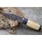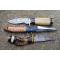 Le 2 Damas : Longueur totale 16cm environ - Longueur de lame 7.5cm environ - Garde & pommeau en laiton - Lame acier damas 256 couches - 1 Manche os & 1 Manche bélier - Etui cuir