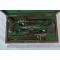 Coffret en noyer à intérieur velours vert frappé à l'or du fabriquant contenant multiples accessoires de rechargement dosette à poudre, tourne vis montés ébène, moule à balle bleui, poire à poudre recouverte de cuir cousu, démonte cheminée, baguette de nettoyage ébène, marteau ébène, boites en ébène à amorces et à cheminée de rechange.