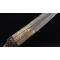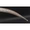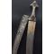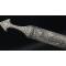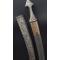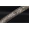 Poignard Jambya Arabie Saoudite monté en argent repoussé à fond perlé, poignée et fourreau décorés de motifs foraux finement ciselés, incrustation de corail en forme de rosaces. Lame de 41.5cm courbe à gorges médiane et double tranchant en damas damasquinée à l'or au talon. Une trace de coup au revers du fourreau. Longueur totale 57cm