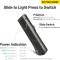 Cette lampe polyvalente et innovante se distingue par son interrupteur coulissant à trois positions intuitives, permettant un changement rapide et fluide entre les niveaux de luminosité et les modes. La batterie lithium intégrée de 1500mAh rechargeable offre une autonomie allant jusqu'à 260 heures selon le mode d'utilisation.