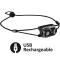 Combiner puissance, poids léger et taille compacte, le défi est réussi en ce qui concerne la Bindi développée par Petzl. De la puissance on en a : 200 lumens et 50 mètres de portée en vision lointaine. De la légèreté, on en a : 35 grammes sur la balance. De la compacité, on en a : 50 x 30 x 20 mm et pas un millimètre de plus. La cerise sur le gâteau, on l'a aussi grâce au bandeau optimisé qu'on ne retrouve que sur cette lampe frontale (Petzl Bindi) : un bandeau que l'on peut fixer aussi bien à la tête ou au cou, aussi bien à la jambe ou au bras et aussi bien à un guidon de vélo ou à un différents supports. Deuxième cerise sur le gâteau : la frontale Petzl Bindi est livrée directement avec une batterie rechargeable intégrée. On peut légitimement parler de lampe frontale rechargeable. La charge s'effectue rapidement et simplement par voie USB. Capacité de la batterie : 680 mAh.