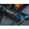 L'interrupteur rotatif est proche de la tête de la lampe ce qui le rend très accessible. Appuyer ou tourner le bouton interrupteur vous permettra d'accèder rapidement aux différents niveaux. Il permet donc un réglage en douceur entre chaque niveaux de luminosité. Il est doté de témoins lumineux permettant d'indiquer sur le côté droit le niveau restant de la batterie (10-25%, 25-50%, 50-75%, >75%) et de l'autre, le niveau de luminosité de la lampe.