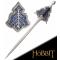 Magnifique replique de GLAMDRING, l'epee utilise par Gandalf dans le film "Le Hobbit". Lame en acier inoxydable, la garde est gravee d'inscription eflique et la poignee est enveloppee de cuir veritable. Longueur de la lame : 47cm longueur totale : 125cm Support mural en metal finement travaille avec tissu bleu. Licence Officielle "The Noble Collection". Vente interdite aux mineurs
