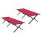 Lit de camping pliant 2 pcs Rouge 193 x 69 x 45 cm Tissu OxfordCe lit de camping pliable a un style minimaliste et met l'accent sur la simplicité. C'est parfait pour les amateurs d'aventure en plein air. Son design simple avec des matériaux résistants aux intempéries s'intègre parfaitement dans n'importe quel camping, offrant un coin sympa pour se reposer après avoir exploré la nature. Matériaux de qualité : Fabriqué en tissu Oxford super résistant, ce lit de camping pliable prend bien les intempéries pour durer lors de tes sorties camping. Son cadre en acier solide maintient le tissu confortable, offrant un endroit stable pour se poser en pleine nature. Design pliable et portable : Ce lit se plie facilement en un format compact, ce qui prend pas de place, le rendant hyper portable. Tu peux le déplier sans outils en un clin d'oeil, parfait pour le camping rapide. Stylé et fonctionnel : Avec son design minimaliste, il marie parfaitement forme et fonction. Sa forme rectangulaire te donne plein d'espace pour bien dormir et va super bien avec le reste de ton matériel de camping. Polyvalence en extérieur : Spécialement conçu pour le dehors, ce lit peut affronter pas mal de situations. Ses caractéristiques anti-UV permettent au lit de garder sa couleur et sa qualité, même sous le soleil. Entretien facile : Après tes aventures, il suffit d'un petit coup de chiffon sec pour le garder en super état. Ça te fait gagner du temps et de l'énergie, te permettant de te concentrer sur le fun au lieu de passer des heures à nettoyer. Bon à savoir : Maximum 110 kg par siège.