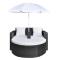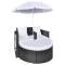 Lit de jardin avec parasol Noir Résine tresséeCet ensemble de salon extérieur en rotin, comprenant un parasol, est conçu de manière esthétique et ergonomique pour faire une déclaration accrocheuse dans votre jardin ou tout environnement extérieur. Cet ensemble de salon est tissé à la main avec de la résine tressée de qualité et revêtu d'un rembourrage blanc crème lisse et doux au toucher. Le matériau PE est entièrement résistant à l'eau et aux intempéries, aux rayons UV, aux taches, facile à nettoyer, garantissant que cet ensemble restera en bon état toute l'année sans être endommagé. Fabriqué en polyester anti-UV et anti-décoloration, le parasol équipé est parfait pour bloquer les rayons UV nocifs du soleil pour vous. Les coussins d'assise et de dossier amovibles apportent également un confort d'assise ultime. Naturellement, le parasol peut être enlevé et rangé afin que l'ensemble puisse également être utilisé sans le parasol pour profiter du soleil. Le repose-pied peut également être détaché pour plus de commodité. Maximum 110 kg par siège. Soyez conscient du risque de feux ouverts et d'autres sources de forte chaleur à proximité du produit.