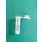 En matière plastique transparente avec couvercle refermable et attaché à son éprouvette afin de préparer les doses au préalable.