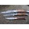 Lot de 3 Couteau Damas Lame Acier 128 Couches Façon Laguiole Abeille Manche Bois Fabrication Artisanale Le Grand : Longueur fermé 12cm - Longueur ouvert 22.50cm - Platines & mitres du manche en nickel - Plaquettes du manche en bois - Tire bouchons - Ressort du dos guilloché avec abeille - Lame en damas 128 couches - Les dessins de la lame sont comme une empreinte, ils sont uniques - Système à cran forcé - Ouverture à 2 mains