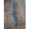 Description : Poignée en polymère noir avec des rainures horizontales prononcées. Fourreau en acier avec un porte-baïonnette en cuir marron. Lame droite, grise, non aiguisée.