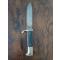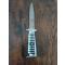 Description : Couteau à lame fixe de type clip-point. Poignée distinctive en métal argenté avec des inserts noirs rayés de métal.