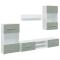 Cet ensemble comprend un meuble mural, un meuble sur pied, deux tableaux bas et une étagère murale.
