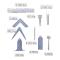 Ensemble des neuf outils symboliques de la franc-maçonnerie : Compas, équerre, niveau, perpendiculaire, maillet, truelle et règle.