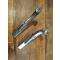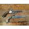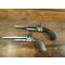 Lot de 2 pistolets à broche type vénerie, canons basculants juxtaposés en table, détentes escamotables, calottes de poignée métalliques, pas de poinçons visibles, calibre 15mm à broche à canon lisse. Longueur 25 et 27 cm.