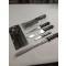 Lot comprenant 1 couteau de boucher lame longueur 19 cms, 1 couteau à saigner lame longueur 16 cms, 1 couteau à jambon lame longueur 30 cms, 1 couteau office lame longueur 8 cms, 1 cassoir lame 18 cms, 1 affûteur pour couteaux et ciseaux, toutes les lames en acier inox et les manches en ABS