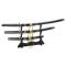 Ce set de sabres est dédié à Hattori Hanzo, célèbre samouraï né en 1541 dans la province de Mikawa. Comprenant un tanto, un wakizashi, et un katana, ces armes ont des lames en acier au carbone avec un tranchant décoratif. Les poignées sont traditionnellement enveloppées, agrémentées de menukis et d'une sous-couche imitant la peau de raie manta. Les tsubas en zinc moulé arborent des ouvertures régulières, et les fourreaux sont ornés. Inclut un support noir pour les sabres. Épées décoratives, non destinées à l'usage.