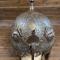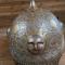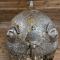 Dans la masse de la bombe sont embossés 4 visages en relief également répartis sur le pourtour. Les détails du visage sont rehaussés d'un koftgari d'or et surmontés d'une couronne rayonnante également en koftgari d'or. Deux porte-plumets cylindriques au trai d'or encadrent un nasal mobile réglable via la visse papillon et un fin camail à dents loup de cotte de maille renforce la protection de la nuque. L'ensemble est gravé d'un décor en fond descendu avec dorures, une frise d'inscriptions coraniques discrètement surlignée d'argent court sur la base de la bombe à la jonction avec les perçages de fixation de la cote de maille.