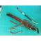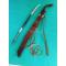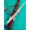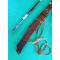LA POIGNEE DU PETIT COUTEAU EST EN CORNE DE CERF . LA POIGNEE ET LE FOURREAU DU SABRE SONT EN BOIS PRECIEUX .