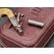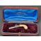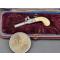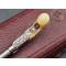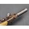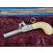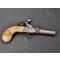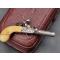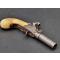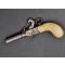 Très rare minuscule pistolet de voyage ou à coffre à canon dévissable dit à balle forcée, production d'un bijoutier au XIXè, mécanisme fonctionnel, crête du chien abimée, crosse monobloc en matière blanche naturelle, coffret cuir et velours. Longueur de l'arme 44mm