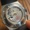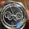 Cette montre, avec ses poussoirs et sa couronne en caoutchouc noir, est animée par le calibre Co-Axial 3890 visible à travers le fond du boîtier transparent.