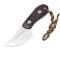 Son manche de 7cm est en micarta marron avec oeillet pour le passage d'un cordon avec deux vis larges pour contraster avec le couteau.