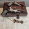 Magnifique paire de pistolets juxtaposés à coffre de luxe en calibre 12mm et 9mm à broche signé BOISSY en coffret,contenant 2 cartouches 9mm et 12mm d'époque,pièce en bronze Napoléon 3 et 10 centimes d'Italie 1866.