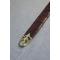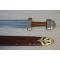 Le fourreau a été réalisé sur mesure par Dominique Humbert - Artisanat historique. Il est fait d'une âme en bois doublée de drap de laine, et gainée de cuir tanné artisanalement. Le pontet (passant de ceinture), les renforts en cordelette entrecroisée, et la bouterolle en laiton sont basés sur des exemples historiques (enluminures ou archéologie). Le motif des croisillons sur le fourreau est assorti au damasquinage de la lame, et le maintien de l'épée dans le fourreau est parfait.