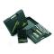 Set de rechargement pour armes à silex composé de 40 éprouvettes à poudre en verre contenant 100 grains de poudre, d'une poire à pulvérin pour l'amorçage, d'une épinglette, d'une poire à poudre, d'une mesure à poudre et de 100 ml de solvant Solblack.