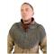 Le "gorgerin" en armure en mailles est une pièce d'armure qui protège la gorge et la partie supérieure du cou d'un combattant. Il s'agit généralement d'une section de l'armure en mailles, composée de mailles de métal entrelacées, conçue pour protéger cette zone sensible du corps. Le gorgerin fait partie intégrante de l'ensemble d'armure en mailles utilisé dans les périodes médiévales et est souvent porté avec d'autres pièces d'armure pour une protection complète du haut du corps. Cette pièce contribuait à protéger le combattant des coups et des attaques visant la gorge, une zone vulnérable lors des combats médiévaux.