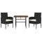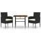 Mobilier à dîner d'extérieur 3 pcs Résine tressée NoirCe mobilier à dîner d'extérieur, au design élégant, est un excellent choix pour vos repas ou vos moments de détente sur votre patio ou dans votre jardin. Matériau de qualité supérieure : l'ensemble de salle à manger de jardin est conçu avec de la résine tressée imperméable, ce qui le rend facile à nettoyer, résistant à l'usure et adapté à une utilisation quotidienne à l'extérieur.Cadre robuste : doté d'un cadre en acier, la table et les chaises sont durables et stables.Chaises confortables : les chaises de jardin sont conçues dans une forme plus ergonomique pour un confort maximal. Des coussins sont inclus pour un soutien supplémentaire.Table pratique : le dessus de table est en bois d'acacia solide pour un support résistant, facile à nettoyer et à entretenir. Remarque :Afin de prolonger la durée de vie de votre mobilier d'extérieur, nous vous recommandons de le protéger avec une housse imperméable. Maximum 110 kg par siège. Soyez conscient du risque de feu ouvert et d'autres sources de forte chaleur à proximité de l'appareil.