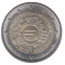 Au centre de la pièce est représenté la Terre avec le symbole "€". Tout autour de la planète sont représentés par différents symboles des acteurs économiques : la Banque centrale européenne par le siège de la BCE, l'écologie et l'énergie par les éoliennes, les industries avec l'usine, les villes par les habitations, les citoyens européens par les personnages et le commerce par le bateau.