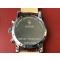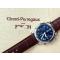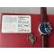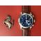 Boîtier bleu marine avec chiffres arabes et index tritiés, cadrans auxiliaires pour les secondes, les compteurs 30 minutes et 12 heures, guichet pour la date.