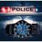 Dispose d'un cadran rond bleu avec le logo de la police et d'un bracelet en nylon