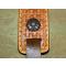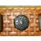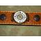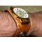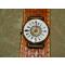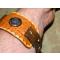 Le bracelet est entièrement fait main à partir de cuir de qualité à tannage végétal. Estampage "basket" (motif imitant le tressage de vanerie, très utilisé par les artisans américains) et teinture façon western avec conchos métalliques de part et d'autre de la montre. Largeur du bracelet: 4cm