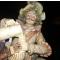 Sujet en porcelaine polychrome représentant un mousquetaire se servant à boire, sur un chaise à pieds en forme de sphinges. Vers 1900. Cachet au revers