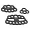 Les avantages de ce modèle sont nombreux : les trous de 19 mm laissent passer la bague de la plupart des mousquetons pour permettre leur retournement, et ils sont compatibles avec le passage des cordes ou des sangles pour une connexion directe. Le trou de connexion principal peut accueillir jusqu'à trois mousquetons, et la rangée de trous de connexion de nombre impair permet de centrer et d'équilibrer le système, permettant une utilisation simultanée jusqu'à trois utilisateurs.