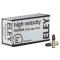 22Lr Eley High Velocity HP22 Long Rifle, haute vélocité, pointe creuse, douille noire oxydée. 10 boîtes de 50 soit un lot de 500. . 22 LR bte de 500 energie : 179 J Grains : 38 Grammes : 2,46 Longueur :2,54 cm Ogive/balle : Hollow point (creuse) Poids : 2,46 g Vitesse : 381m/s