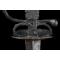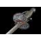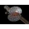 Monture. Monture en argent à poignée filigranée et viroles en tête de turc. La monture est composée d'un pommeau rond, d'une branche, d'un quillon, d'annelets développés, d'un écusson et d'un pied d'écusson rectangulaires et d'une coquille bivalve. Le filigranage se compose d'un filigrane double suivi d'un plus gros filigrane double inversé pour former une tresse, puis d'environ quatre filigranes doubles bien plus petits. La monture est décorée de dragons dans un style rocaille sur chacun de ses éléments, sauf la branche ornée respectivement d'une plante. Ces motifs sont accompagnés de nombreuses montures rocaille. La marge de la coquille, les annelets et la branche sont ondulés. Cravate en feutrine rouge présente. Anciennes traces de dorure laissant deviner qu'il s'agissait de vermeil à l'origine. Bon état.