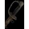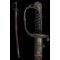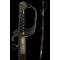 Fourreau. Fourreau en cuir noir rainuré mais visiblement dégradé. Trois garnitures en laiton à deux anneaux de bélière et bouton de chape (arraché). La chape présente une ancre surmontée d'une couronne royale, là où la garniture centrale et la bouterolle sont décorées de branches de laurier et de chêne. Chaque garniture est agrémentée de coquilles Saint-Jacques. La chape et la garniture centrale sont mobiles sur le fourreau (ne tiennent plus que par friction). Mauvais état, bien que complet.