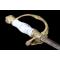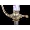 Monture. Monture en laiton doré et cuivré à poignée monobloc en porcelaine. Elle est composée d'un pommeau rond, d'une branche, d'un quillon mamelonné, d'un écusson réduit, d'un pied d'écusson oval, sans annelets ni coquille, mais munie d'une boucle latérale avec un plateau développé. Les parties en laiton sont décorées dans un style rococo allemand, caractérisé par des fleurs, des cartouches rocaille et des coquilles Saint-Jacques. Les représentations sur la poignée en porcelaine ne subsistent que partiellement. On y distingue une scène de bataille à cheval avec cinq personnages montés et un arbre. Le personnage au premier plan sur un cheval blanc porte un uniforme militaire distinctif et sonne le clairon. Les quatre autres se battent au sabre mais ne sont plus aussi distinguables. Traces de la cravate encore présentes. Bon état.