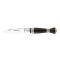 Parmi cette production du genre dont l'opinel est le chef de file ,ce Nontron boule est à mon avis le plus" sexi" même si cette photo,exagérant l'ampleur de la boule, nuit plutôt qu'elle ne sert l'appréciation que l'on peut en avoir.Sa prise en main est confortable et l'absence d'angles vifs épargne les fonds de poche troués.L'affûtage doit être repris avec "obstination"et des pierres à grains de plus en plus fins pour finir par un passage sur un cuir enduit de pâte à polir comme tous ces couteaux sortis d'émouture qu'on nous propose actuellement:pris au sortir de sa boîte c'est décevant,mais dès qu'on s'est un peu escrimé sur l'affûtage,c'est un rasoir.Il a pour lui sa légéreté et le look de sa lame feuille de saule L l'association bois d'ébène, métal légèrement fumé de la bague et cette lame au poli miroir le rend très désirable.