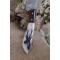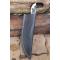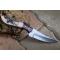 Longueur du manche 11.5cm - Longueur de la lame 11.5cm - Lame en Acier damas 256 couches - Lame de type trailing point - Construction d'une seule pièce - Full tang - Plaquettes du manche en os avec tête de cerf - Mitres en bois - Fabrication Artisanale - Les dessins de la lame sont uniques comme une empreinte - Etui simili cuir