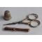 Petit nécessaire de couture en vermeil (argent doré) contenant un dé à coudre en argent, une petite paire de ciseaux et un étui à aiguilles d'époque XIXe siècle écrin en os (bovin), couvercle gravé : aiglon sur une couronne de Baron et MCF bon état, sauf un petit infime manque sur la pointe des ciseaux, voir photos
