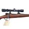 Carabine de fabrication Allemande par Mauser type 98 au calibre 6.5x55SE. Carabine dotée d'un canon de 72cm à l'état intérieur parfait. Canon non fileté. L'état extérieur est bon, patiné, avec un bronze à 85%. Canon dépourvu de ses organes de visée. Ensemble boitier culase en très bon état pour son âge, mécanique testée et révisée, impeccable.Boitier perçé avec des embases Weaver sur lesquels est montée une lunette TASCO 2-7x32 en bon état optique, mais à l'esthétique marquée. Approvisionnée par un magasin 4+1 avec trappe de vidange de type Mauser. La crosse avec joue anglaise est en état correct, avec des fentes réparées et stabilisées et de l'usure effacant le quadrillage de la poignée. Plaque de couche polymère.Dispose de ses anneaux de grenadière.