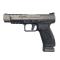 Pistolet de fabrication Turque par CANIK, modèle TP9sfx TUNGSTENE au calibre 9x19. Pistolet semi automatique disposant d'un canon de 125mm à l'état intérieur comme neuf. L'état de la glissière est très bon, ne possèdant pas de traces d'utilisation particulière. Le bâti en polymère est également en excellent état et ne fait pas état d'une utilisation intensive. Ce pistolet permet le montage d'un point rouge. Comme sur toutes les armes de ce fabricant, lorsque l'on approche des 1000 coups, certaines traces apparaissent : traces de frottements des douilles au niveau de la fenêtre d'ejection, légère décoloration du revêtement du canon... Approvisionné par un chargeur de 20 cartouches. Arme possédant un avertisseur de chargement. Cette arme est livrée avec 2 chargeurs 20 coups, un lot de pièces détachées, un dosseret afin d'ajuster la poignée du pistolet, 4 embases pour le montage d'optique, un holster rigide polymère et sa malette d'origine.